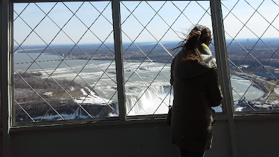 As cataratas ficam mesmo na fronteira com o Estado de Nova Iorque, nos EUA, e têm uma parte canadiana e outra americana (a canadiana é mais imponente). As três primeiras fotos são da parte americana. A queda de água estava em estado líquido, mas a parte plana, do rio, estava gelada nesta zona.