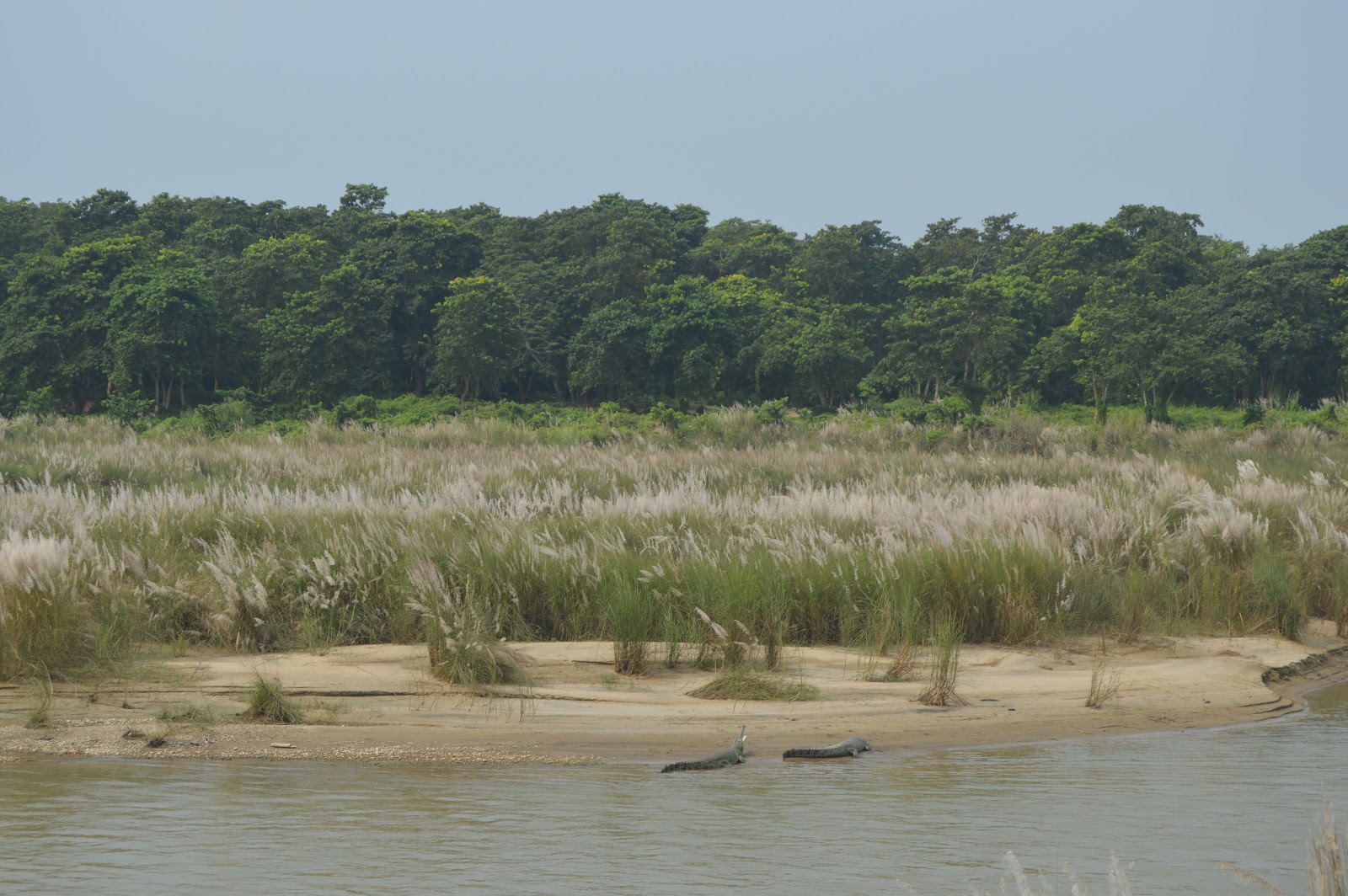 Do aeroporto de Sauhara a Chitwan são uns 20km, numa viagem que dura à volta de 30 minutos. Ficámos hospedados no Jungle Wildlife Camp, um dos muitos hotéis com vista para o rio e para a selva. Cá está a vista que tínhamos (não dá para ver bem, mas ao fundo estavam elefantes a tomar banho).