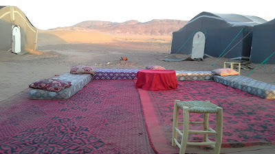 Chegados a Zagora, ao final da tarde, fomos ter ao ponto de encontro acordado, onde fomos recebidos pelo anfitrião das tendas Bivouac Karim Sahara, que nos apresentou a um dos três árabes (mega simpáticos!) que iam "cuidar de nós" no deserto. Do centro de Zagora até à zona do deserto são uns 10 km, que percorremos de carro atrás do nosso guia (que ia de moto). Estacionámos muito perto das tendas.